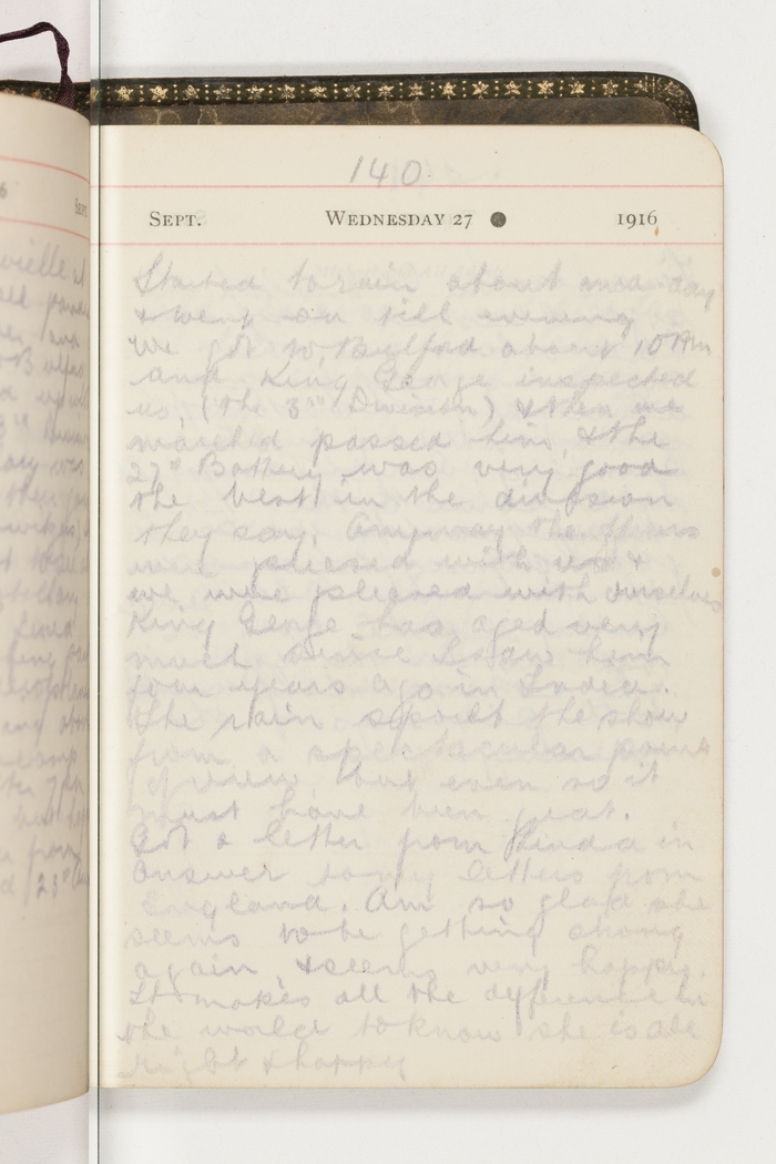Started to rain about mid-day & went on till evening. We got to Bulford about 10 am and King George inspected us (the 3rd Division) & then we marched passed him & the 27th Battery was very good the best in the division they say. Anyway the officers were pleased with us & we were pleased with ourselves. King George has aged very much since I saw him four years ago in India. The rain spoilt the show from a spectacular point of view, but even so it must have been great. Got a letter from Linda in answer to my letters from England. Am so glad she seems to be getting strong again, & seems very happy. It makes all the difference in the world to know she is all right & happy.