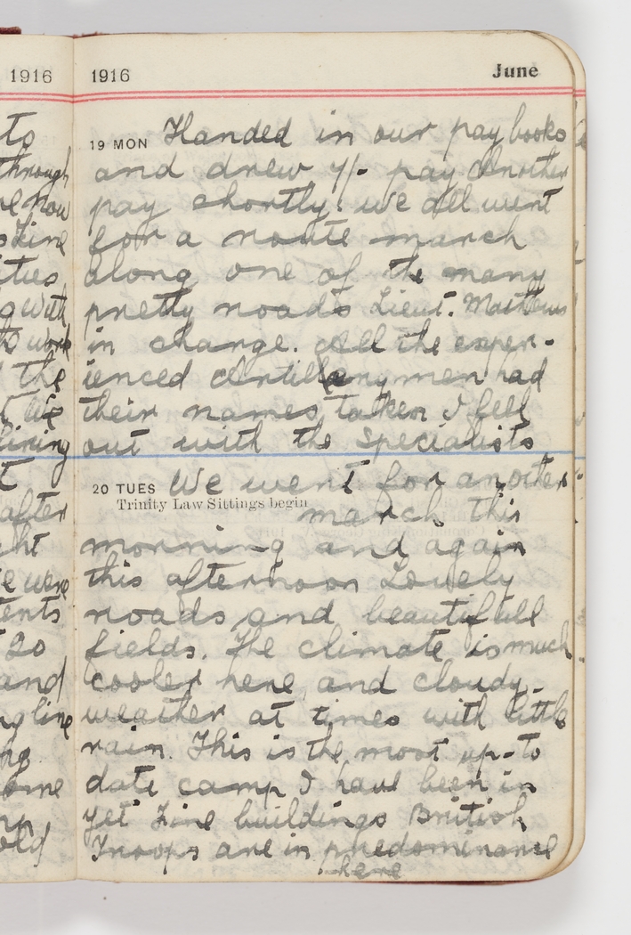 <p>[Page 102]<br />June 19 Mon Handed in our pay books and drew 7/- pay. Another pay shortly. We all went for a route march along one of the many pretty roads Lieut. Matthews in charge. All the experienced Artillery men had their names taken I fell out with the Specialists</p><p>June 20 Tues We went for another route march this morning and again this afternoon Lovely roads and beautifull fields. The climate is much cooler here and cloudy weather at times with little rain. This is the most up-to date camp I have been in yet Fine buildings British Troops are in predominance here.</p>