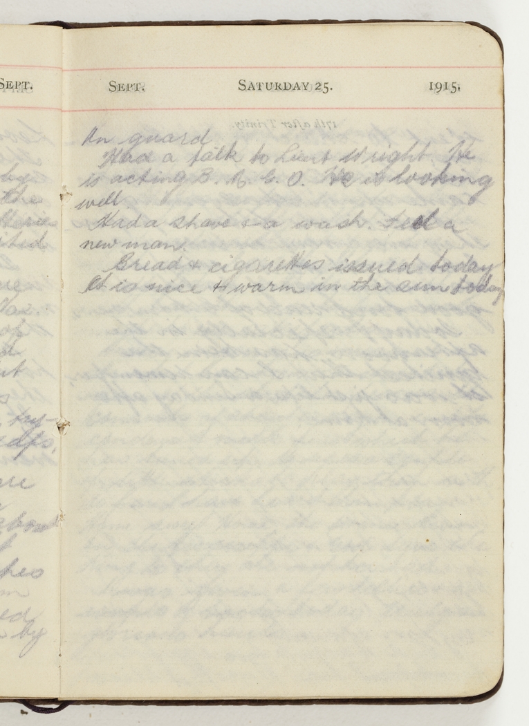 Had a talk to Lieut Wright. He is acting B.M.G.O. [Battalion Machine Gun Officer]. He is looking well.