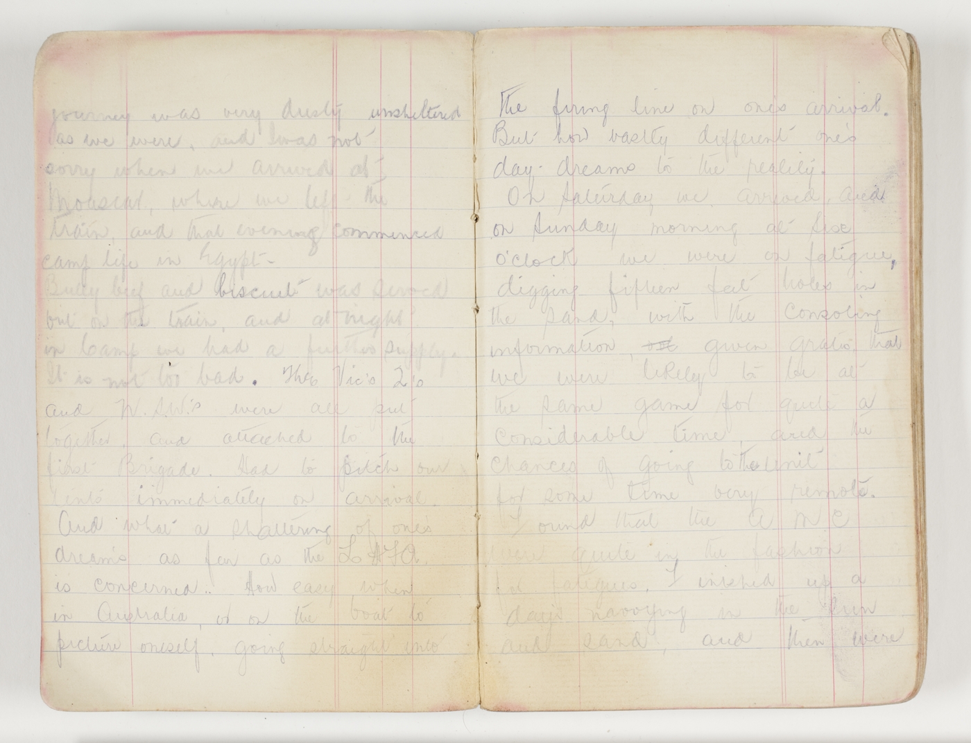 journey was very dusty unsheltered as we were, and I was not sorry when we arrived at Moascar, where we left the train, and that evening commenced camp life in Egypt. Bully beef and biscuit was served out on the train, and at night in Camp we had a further supply. It is not too bad. The Vic's Q's and N.S.W's were all put together, and attached to the first Brigade. Had to pitch our tents immediately on arrival.