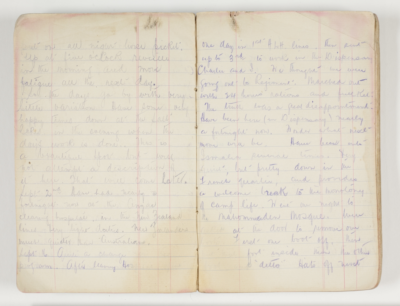 Sept 16 Quite a change in the program. After leaving Hospital spent one day in 1st ALH lines, then sent up to 3rd to work in the Dispensary Charlie and I. We thought we were going out to Regiment. Marched out with 24 hours rations and full kit. The truth was a great disappointment. Have been here (in Dispensary) nearly a fortnight now. Wonder what next move will be. Have been into Ismalia several times, very quiet, but pretty down in the French quarter, and provides a welcome break to the monotony of camp life. Went one night to the Mahommaden Mosque. Were asked at the door to remove our boots. First one boot off, then put that foot inside, then the other boot and ditto Hats off next