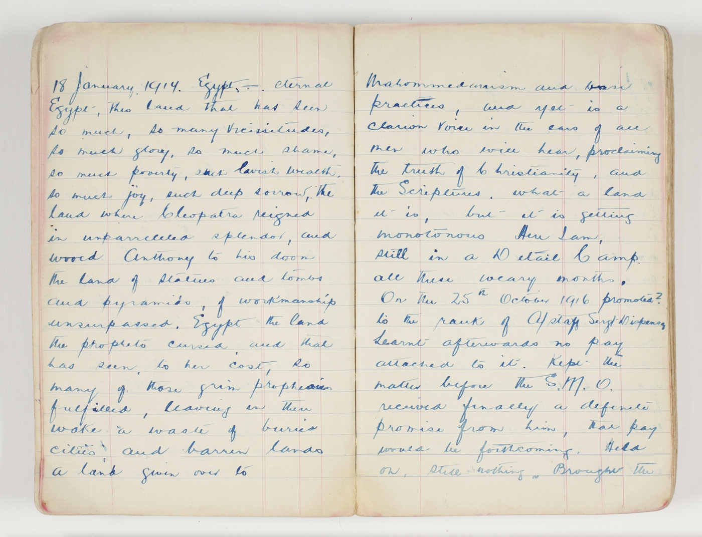 18 January 1917. Egypt – eternal Egypt, this land that has seen so much, so many vicissitudes, so much glory, so much shame, so much poverty, such lavish wealth, so much joy, such deep sorrow, the land where Cleopatra reigned in unparreleled splendor, and wooed Anthony to his doom the land of statues and tombs and pyramids, of workmanship unsurpassed. Egypt the land the prophets cursed, and that has seen, to her cost, so many of those grim prophicies fulfilled, leaving in their wake a waste of buried cities, and barren lands a land given over to Mahommedanism and base practices, and yet is a clarion voice in the ears of all men who will hear, proclaiming the truth of Christianity, and the Scriptures. what a land it is, but it is getting monotonous