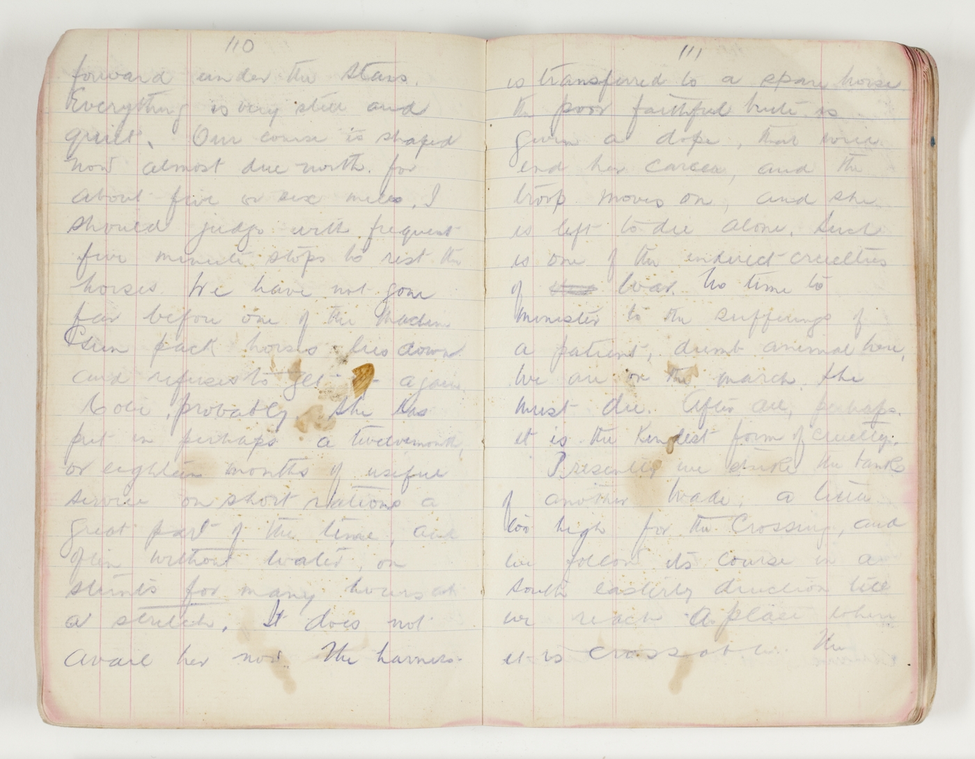 forward under the stars. Everything is very still and quiet. Our course is shaped now almost due north for about five or six miles, I should judge, with frequent five minute stops to rest the horses. We have not gone far before one of the Machine Gun pack horses lies down and refuses to get up again, Colic probably, She has put in perhaps a twelvemonth, or eighteen months of useful service on short rations a great part of the time, and often without water, on stunts for many hours at a stretch. It does not avail her now. The harness is transferred to a spare horse, the poor faithful brute is given a dope, that will end her career, and the troop moves on, and she is left to die alone. Such is one of the indirect cruelties of war. No time to minister to the sufferings of a patient, dumb animal here. We are on the march. She must die. After all, it is the kindest form of cruelty.