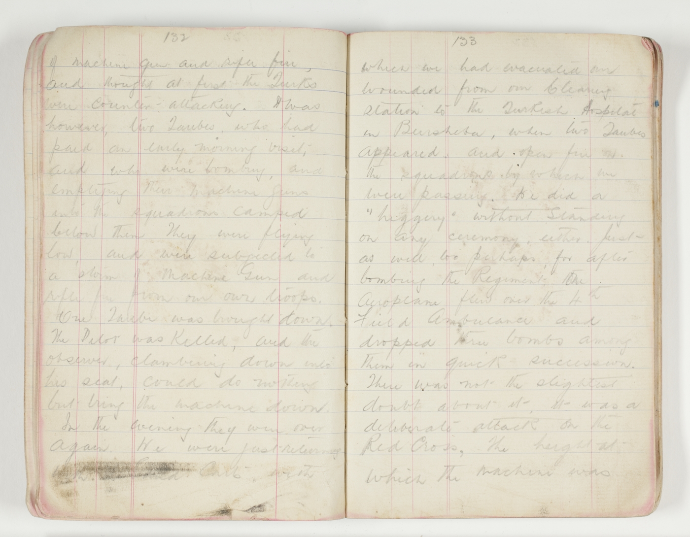 In the evening they were over again. We were just returning [indecipherable] Carts, with which we had evacuated our wounded from our Clearing station to the Turkish Hospital in Beersheba, when two Taubes appeared and open fire on the squadrons by which we were passing. We did a "higgery" without standing on any ceremony, either. Just as well, too perhaps, for after bombing the Regiment, one Aeroplane flew over the 4th Field Ambulance and dropped three bombs among them in quick succession. There was not the slightest doubt about it, it was a deliberate attack on the Red Cross. The height at which the machine was