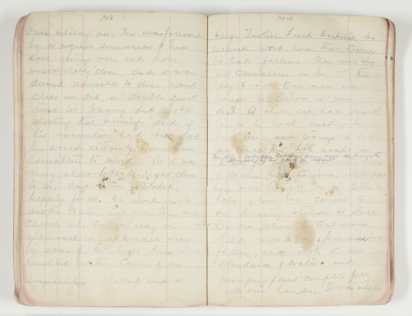 We moved on to another Wadi, and from there were called out. On our way we witnessed a splendid charge by some of the light Horse which resulted in the capture of an Ammunition dump and a large Turkish Field Hospital. We received word here that Derea too had fallen. There were very few casualties in the 1st this day 5-11-17. One man was brought in across a horse dead. A shell cap had struck him in the back, breaking the back bone and tearing a hole you could put both hands in [indecipherable] Death for this poor fellow was of course instantaneous. A couple more were brought in a little later whom we carried to our dressing station at Sherea.