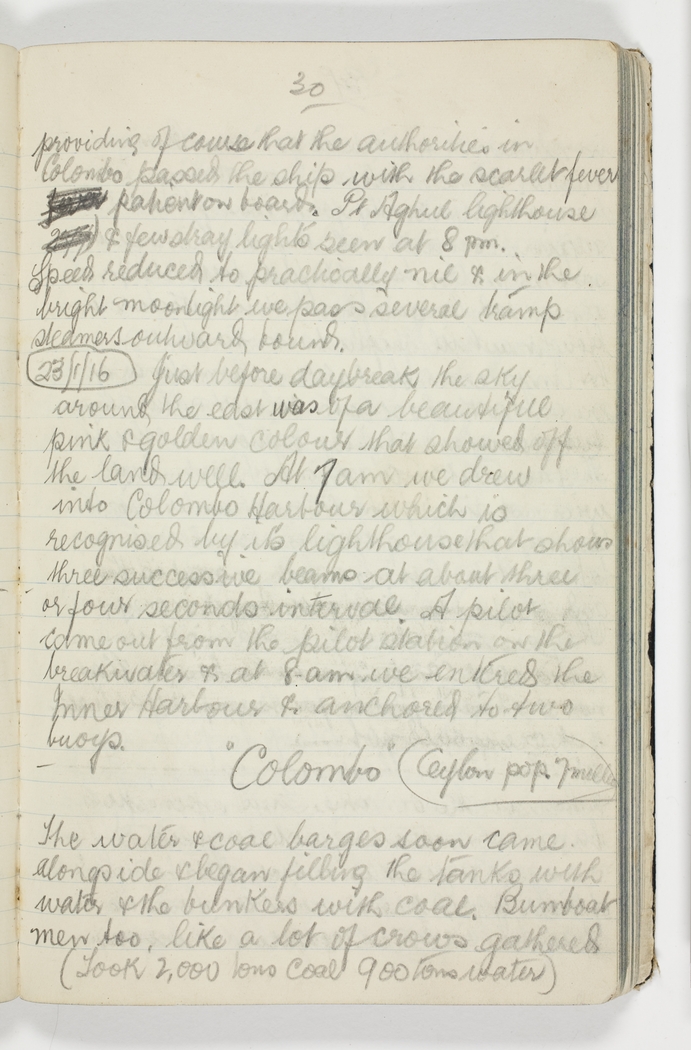 providing of course that the authorities in Colombo passed the ship with the scarlet fever patient on board. Pt Aghul lighthouse & few stray lights seen at 8pm.Speed reduced to practically nil & in the bright moonlight we pass several tramp steamers outward bound.