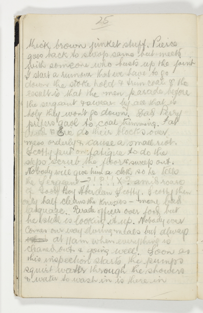 thick brown junket stuff. Pierce goes back to swap same but meets with someone who busts up the joint . I start a rumour that we have to go down the stoke hold & trim coal & the result is that the men parade before the sergeant & swear by all that is holy they won't go down. Dad Perry prefers gaol to coal trimming.