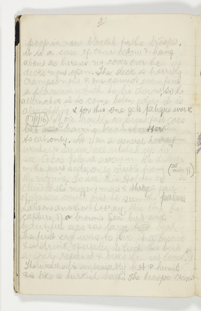 More trouble as breakfast goes bad leaving bread & butter to eat only. At 4 pm a general hooray went up so we all rushed up to see Cocos Island away in the distance on the port side, only visible from ( 25 miles off) the rigging. To see this Holmes & I climbed the mizzen mast & through a pair of glasses could just be seen the palms.