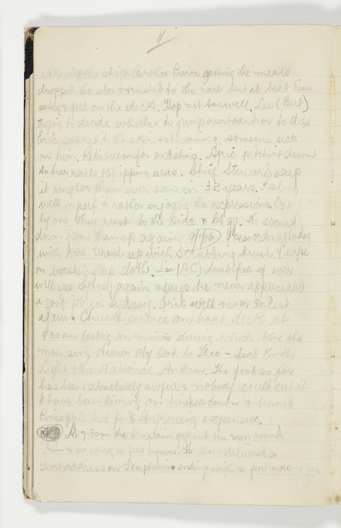 sake stop the ship. Brother Pierce getting the meals dropped the stew & rushed to the rail but it beat him easily & fell on the deck. Hop not too well. Lee [Bert] trying to decide whether to jump overboard or to die. Eric soaked to the skin & shivering, someone sick on him. Retribution for enlisting. Afric pitching down to her rails & shipping seas. Chief Steward says it rougher than ever seen in 32 years. Feeling well myself and rather enjoying the expressions. One by one they rush to the side & let go. No sooner down below than up again .9/1/16 Mess orderly today with Ivers. Wash up with scrubbing brush & wipe on washing up cloth. Lee (AC) doubtful if ever will see Sydney again & says he never appreciated a good job in Sydney. Eric will never enlist again .