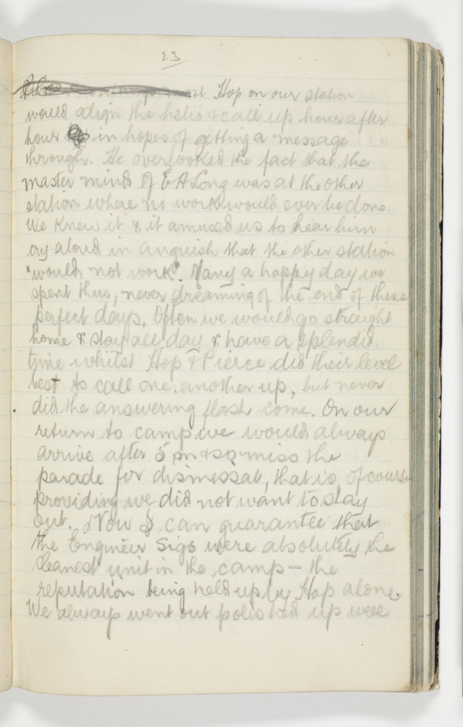 Often we would go straight home & stay all day & have a splendid time whilst Hop & Pierce did their level best to call one another up, but never did the answering flash come. On our return to camp we would always arrive after 5 pm & so miss the parade for dismissal, that is of course providing we did not want to stay out. I vow I can guarantee that the Engineer Sigs were absolutely the cleanest unit in the camp – the reputation being held up by Hop alone. We always went out polished up well