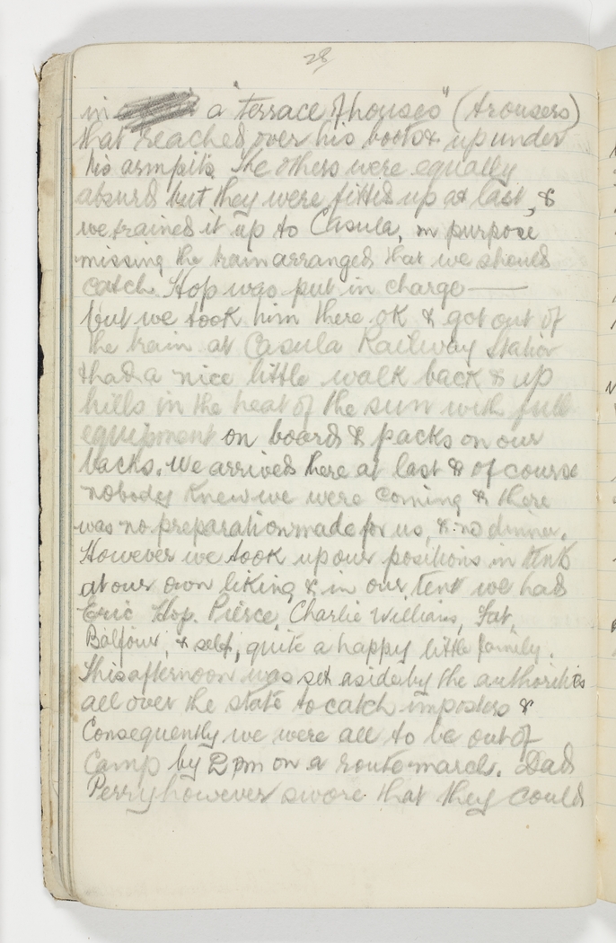 in a "terrace of houses" (trousers) that reached over his boots & up under his armpits. The others were equally absurd but they were fitted up at last, & we trained it up to Casula, on purpose missing the train arranged that we should catch. Hop was put in charge --- but we took him there ok & got out of the train at Casula Railway Station & had a nice little walk back & up hills in the heat of the sun with full equipment on board packs on our backs.. We arrived here at last & of course nobody knew we were coming & there was no preparation made for us, & no dinner. However we took up our positions in tents at our own liking & in our tent we had Eric, Hop, Pierce, Charlie Williams, Fat, Balfour, & self, quite a happy little family.