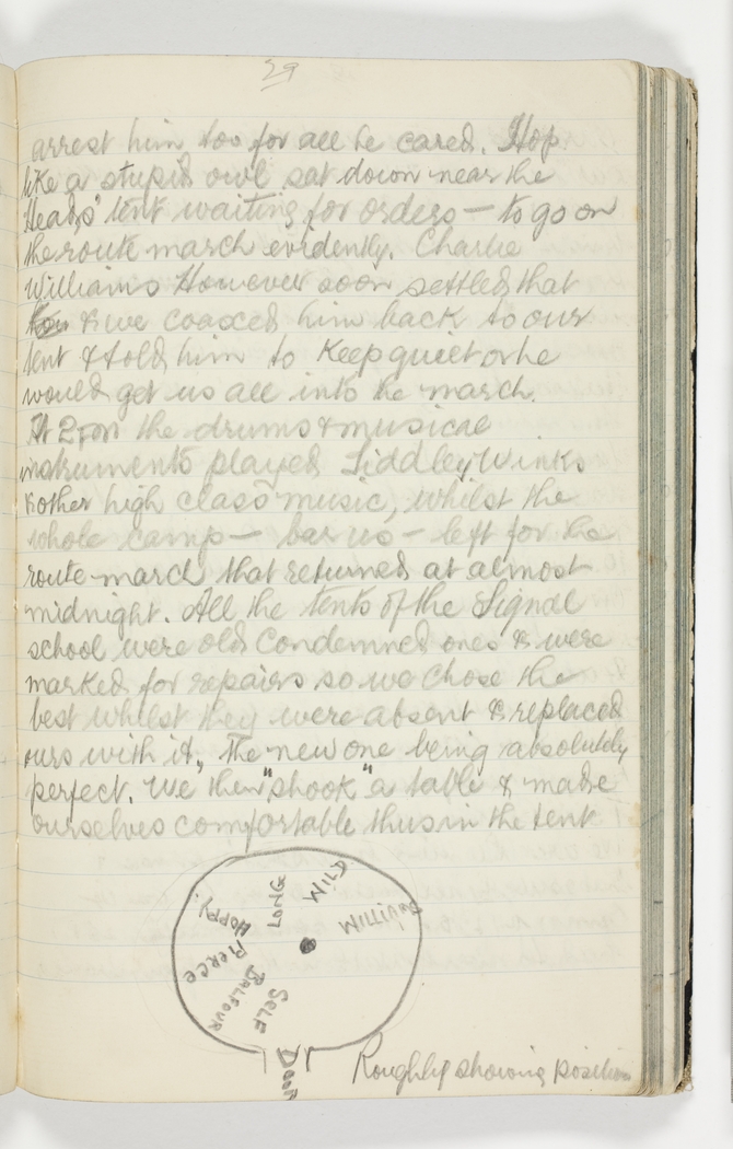 arrest him too for all he cared. Hop like a stupid owl sat down near the Head's tent waiting for orders - to go on the route march evidently. Charlie Williams however soon settled that & we coaxed him back to our tent & told him to keep quiet or he would get us all into the march.