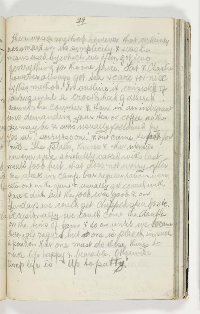 The plates, knives & other utensils however were absolutely caked with last meal's food but that does not worry after one week in camp. Our regular rations were eaten out in the open & usually got covered with grass & dirt but the food was good & on Sundays we could get chipped spuds etc .Occasionally we could come the double on the tins of jam & so on until we became thorough rogues but one is placed in such a position that one must do these things to make life happy & bearable. Otherwise camp life is "Up to putty."