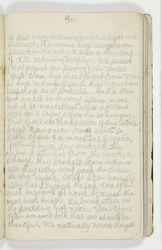 at first were interesting until we got into the desert. Numerous huge camps were passed on the way & also a trainload of N.Z. returning soldiers. We passed [& at present are passing the canal quite close, but it is blocked from view by huge mounds of earth that have been heaped up as a protection.