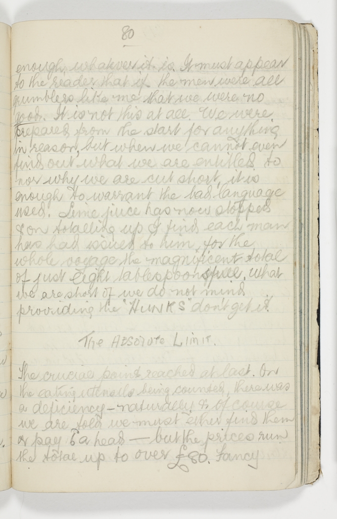 enough whatever it is. It must appear to the reader that if the men were all grumblers like me that we were no good. It is not this at all . We were prepared from the start for anything in reason, but when we cannot even find out what we are entitled to nor why we are cut short, it is enough to warrant the bad language used. Lime juice has now stopped & on totalling up I find each man has had issued to him for the whole voyage the magnificent total of just eight tablespoonsfull. What we are short of we do not mind providing the "HUNKS" don't get it.