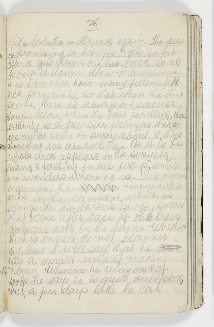 The sea is promising a bit of a roll, so Fat Hart gets down on his back so as to keep it down. How marvellous it is to notice how many fellows felt sick previously so that when the time comes, there is always an excuse. Down below, when the boat is rolling, there certainly is a peculiar feeling as there are no articles to sway about & thus show that we are rolling. As it is the whole deck appears to be swaying rising & falling in all ways, until one wonders where he is. On making enquiries, the men who serve in the canteen, which is alongside the barber's shop swear that case after case of Red Cross goods are sold by the barber. Whether this is correct or not, I cannot say, but I will say that he has a smart way of making money. Whenever he runs out of goods he says he is quite out of stock, but a few days later he can
