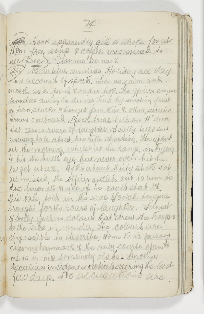 Mock trial held on "H" deck that causes roars of laughter .Scotty tells an amusing tale about his rifle shooting. He spent all the morning, whilst at the range in trying to hit the bull's eye, but never even hit the target at all. After about thirty shots that all missed, the officer yelled out to him fix bayonets & see if he could stab it. This tale, told in the real Scotch tongue brought forth roars of laughter. Sunset of lovely golden colour that drew the troops to the side in wonder. The colours are impossible to describe. Some kind person nips my hammock & the only course open to me is to nip somebody els's. Another peculiar incidence noticed during the last few days. No accusations are
