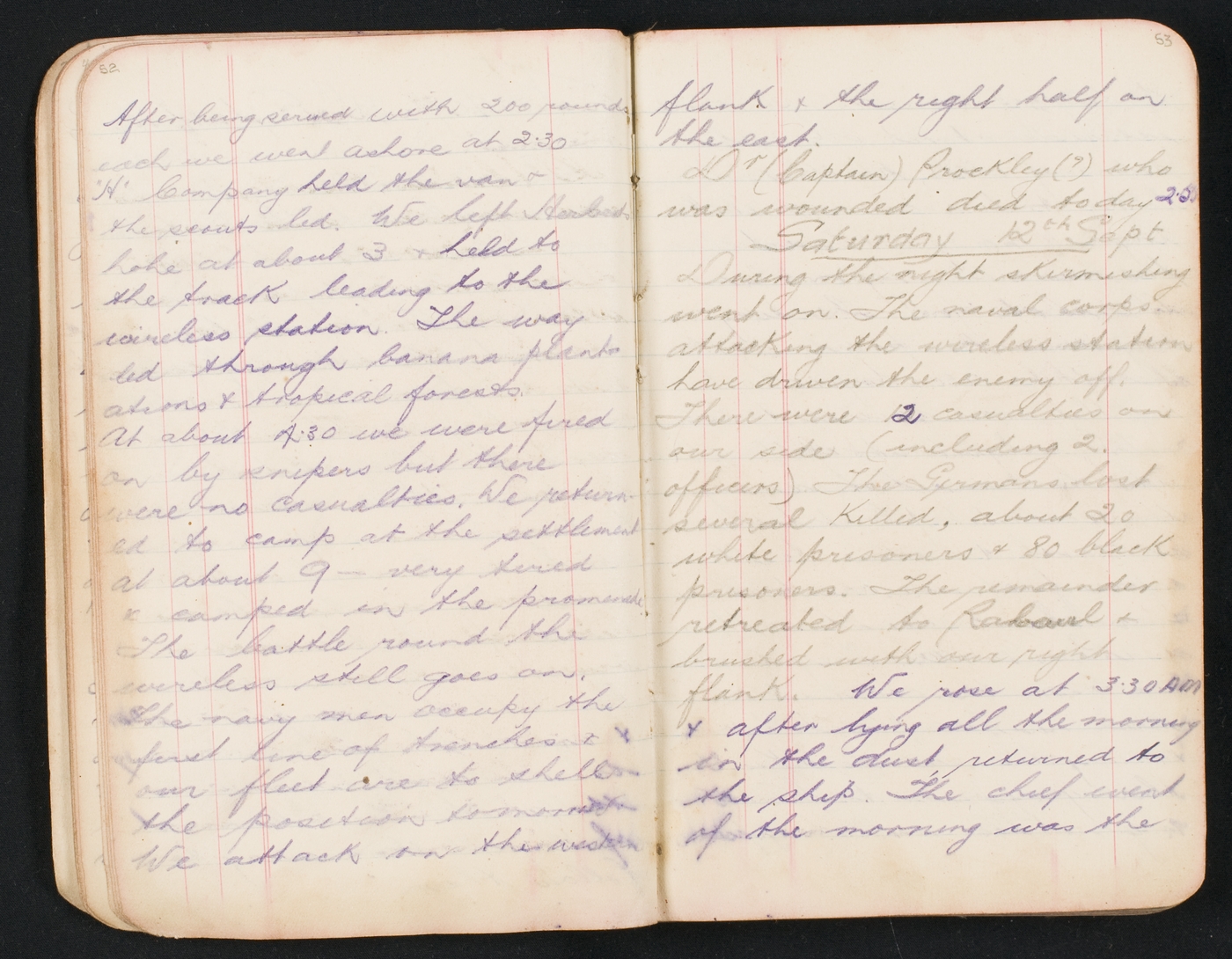 There were 12 casualties on our side (including 2 officers) The Germans lost several killed, about 20 white prisoners & 80 black prisoners. The remainer;' retreated to Rabaul & brushed with our right flank. We rose at 3.30 AM & after lying all the morning in the dust, returned to the ship. The chief event of the morning was the