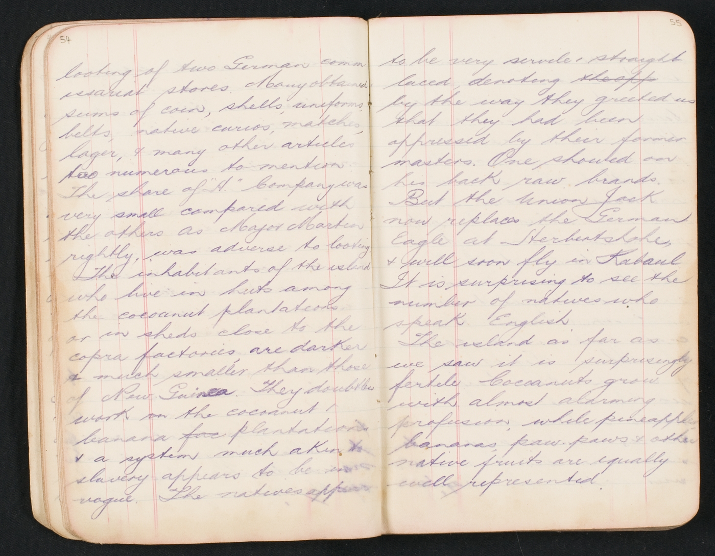 The inhabitants of the island who live in huts among the coconut plantations or in sheds close to the copra factories are darker & much smaller than those of New Guinea They doubtless work on the cocoanut & banana plantations & a system much akin to slavery appears to be in vogue. The natives appear to be very servile & straight laced, denoting by the way they greeted us that they had been oppressed by their former masters. One showed on his back raw brands.But the Union Jack now replaces the German Eagle at Herbertshohe, & will soon fly in Rabaul. It is surprising to see the number of natives who speak English.