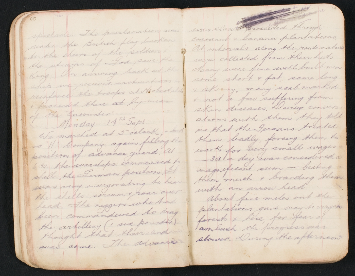 We marched at 5 oclock, "H" Company again filling the position of advance guard. At 6.30 the warships commenced to shell the German positions. It was very invigorating to hear the shells scream & roar over head. The niggers who had been commandeered to drag the artillery (1 six pounder) thought that their end was come. The advance was slow proceeded through cocoanut & banana plantations. At intervals along the route natives were collected from their huts Many were fine well built men some short & fat some long & skinny, many scab marked & not a few suffering from skin diseases. During conversations with them they told us that the Germans treated them badly, forcing them to work for very small wages – 3d a day was considered a magnificent sum – beating them much & branding them with an arrow head.
