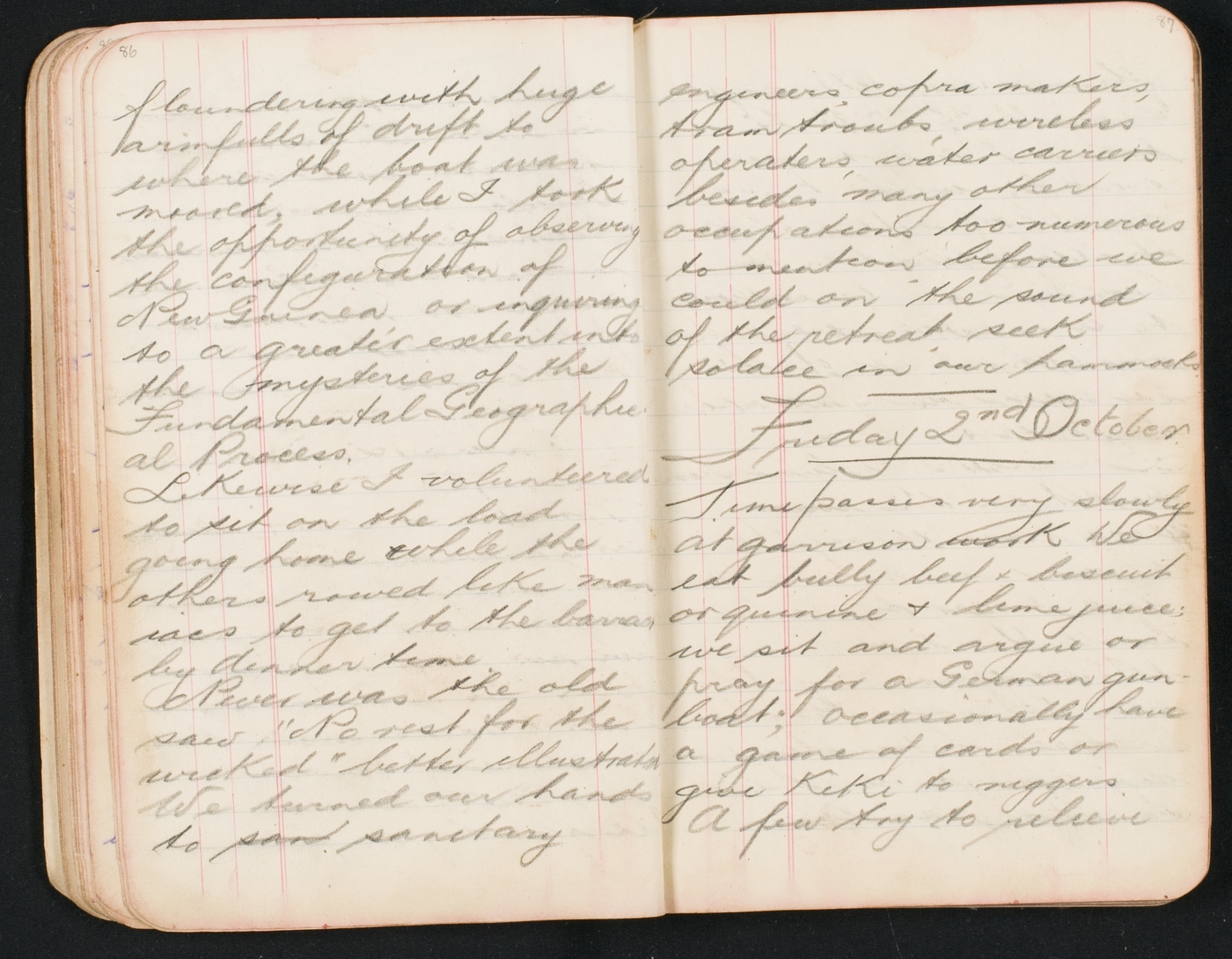 floundering with huge armfulls of drift to where the boat was moored, while I took the opportunity of observing the configuration of New Guinea or inquiring to a greater extent into the mysteries of the Fundamental Geographical Process.