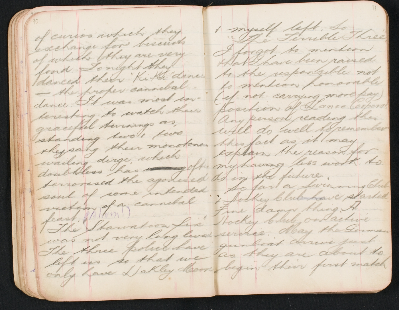 of curios which they exchange for biscuits of which they are very fond. Tonight they danced their "Ki-Ki" dance – the proper cannibal dance. It was most interesting to watch their graceful turnings as, standing two & two they sang their monotonous wailing dirge, which doubtless has often terrorised the agonised soul of some intended victim of a cannibal feast.