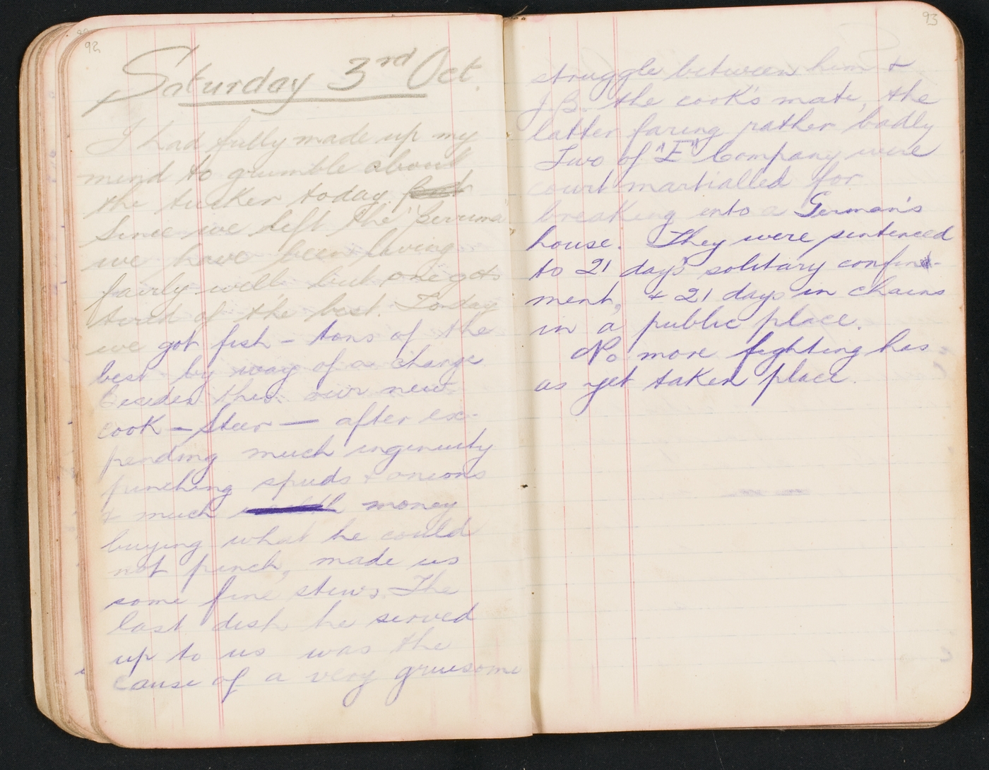 I had fully made up my mind to grumble about the tucker today. Since we left the Berrima we have been living fairly well but one gets tired of the best. Today we got fish – tons of the best by way of change beside this our new cook – Steer – after expending much ingenuity pinching spuds & onions & much money buying what he could not pinch, made us some fine stews. The last dish he served up to us was the cause of a very gruesome struggle between him & J.B. the cook's mate, the latter faring rather badly. Two of "E" Company were courtmartialled for breaking into German's house. They were sentenced to 21 days solitary confinement, & 21 days in chains in a public place.