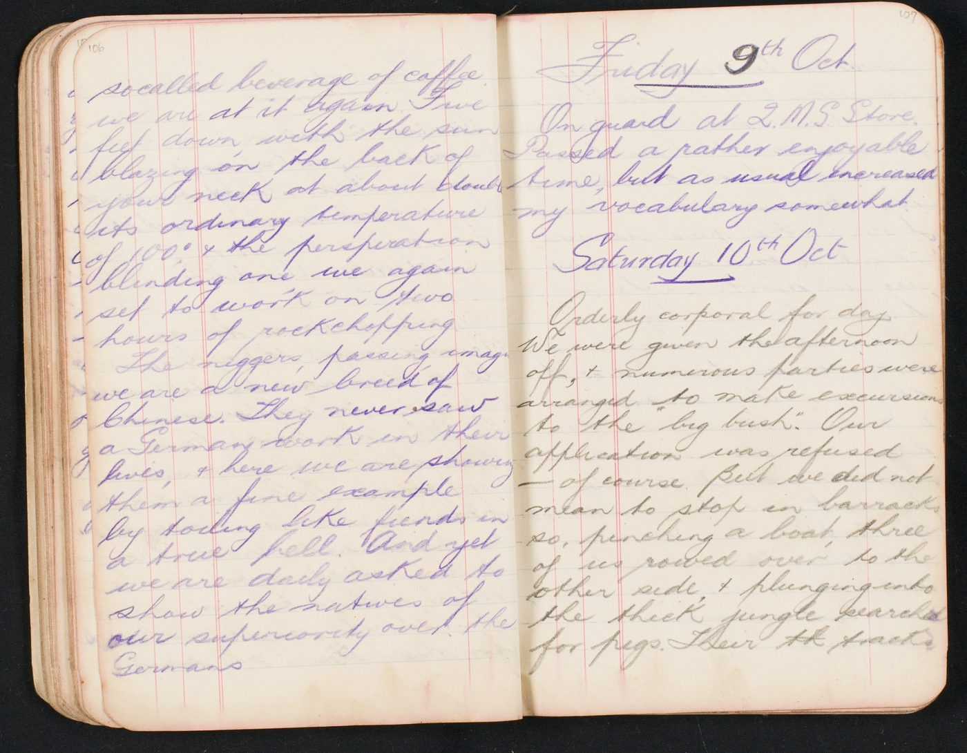 Orderly corporal for day. We were given the afternoon off & numerous parties were arranged to make excursions to the "big bush". Our application was refused – of course. But we did not mean to stop in barracks so, pinching a boat three of us rowed over to the other side & plunging into the thick jungle searched for pigs. Their snouts