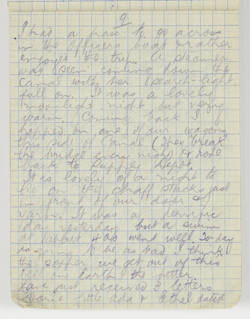 I had a pass to go across in the Officer's boat & rather enjoyed the trip. A steamer was seen coming down the Canal with her search-light full on. It was a lovely moonlight night but very warm. Coming back I hopped on one of our wagons this side of Canal (They "break" the bridge even night) & rode back to Supply Depot.
