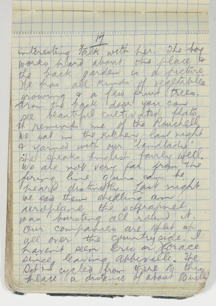 We are not very far from the firing line guns can be heard distinctly. Last night we saw them shelling an aeroplane the schrapnel was bursting all round it. Our companies are split up all over the countryside. I haven't seen Eric or Horace since leaving Abbeville. The Sgt & I cycled from there to this place a distance of about 80 miles