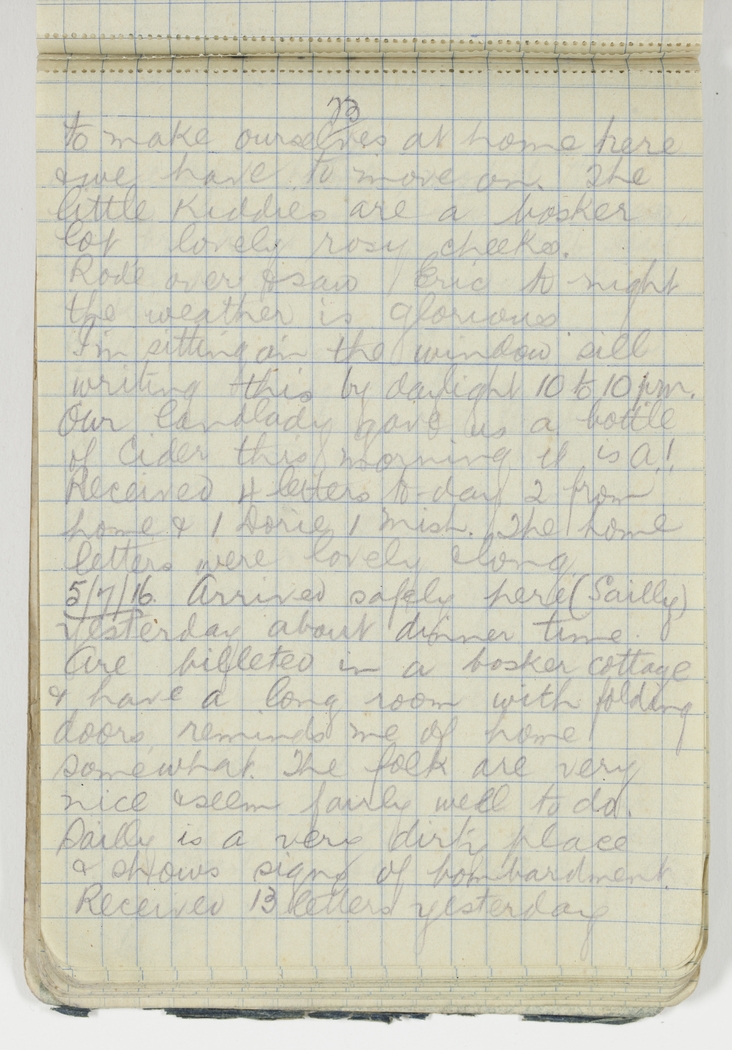 Rode over & saw Eric to-night the weather is glorious. I'm sitting on the window sill writing this by daylight 10 to 10 p.m. Our landlady gave us a bottle of Cider this morning it is A.1. Received 4 letters to-day 2 from home & 1 Dorie 1 Trish. The home letters were lovely & long.