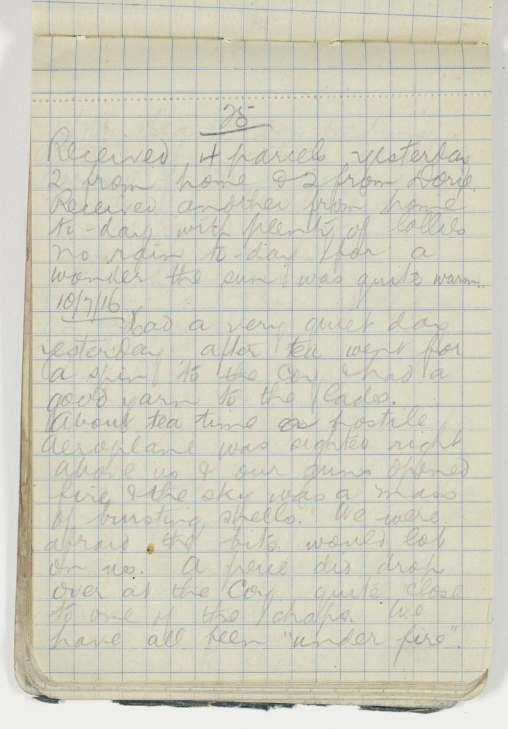 Had a very quiet day yesterday, after tea went for a spin to the Coy & had a good yarn to the lads. About tea time a hostile Aeroplane was sighted right above us & our guns opened fire & the sky was a mass of bursting shells. We were afraid the bits would lob on us. A peice did drop over at the Coy quite close to one of the chaps. We have all been "under fire".