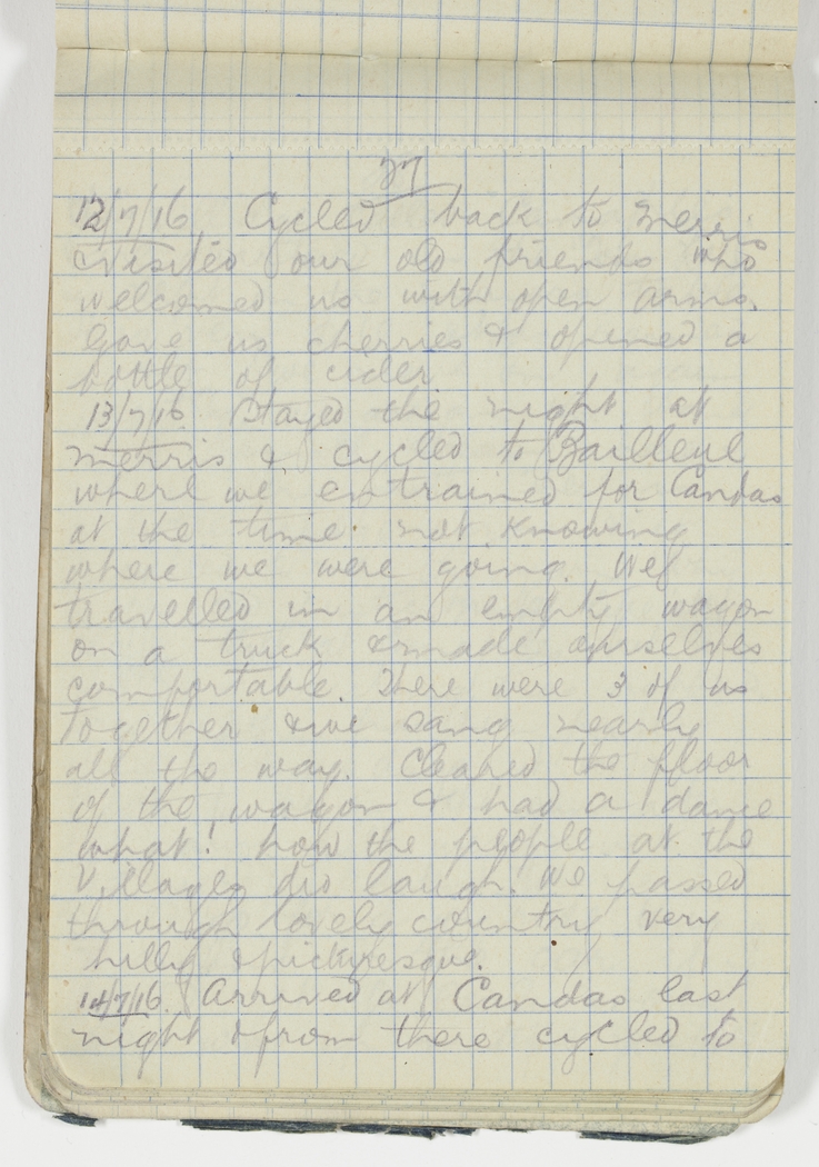 Stayed the night at Merris & cycled to Bailleul where we entrained for Candas at the time not knowing where we were going. We travelled in an empty wagon on a truck & made ourselves comfortable. There were 3 of us together & we sang nearly all the way. Cleared the floor of the wagon & had a dance what! how the people at the Village did laugh. We passed through lovely country very hilly & picturesque.