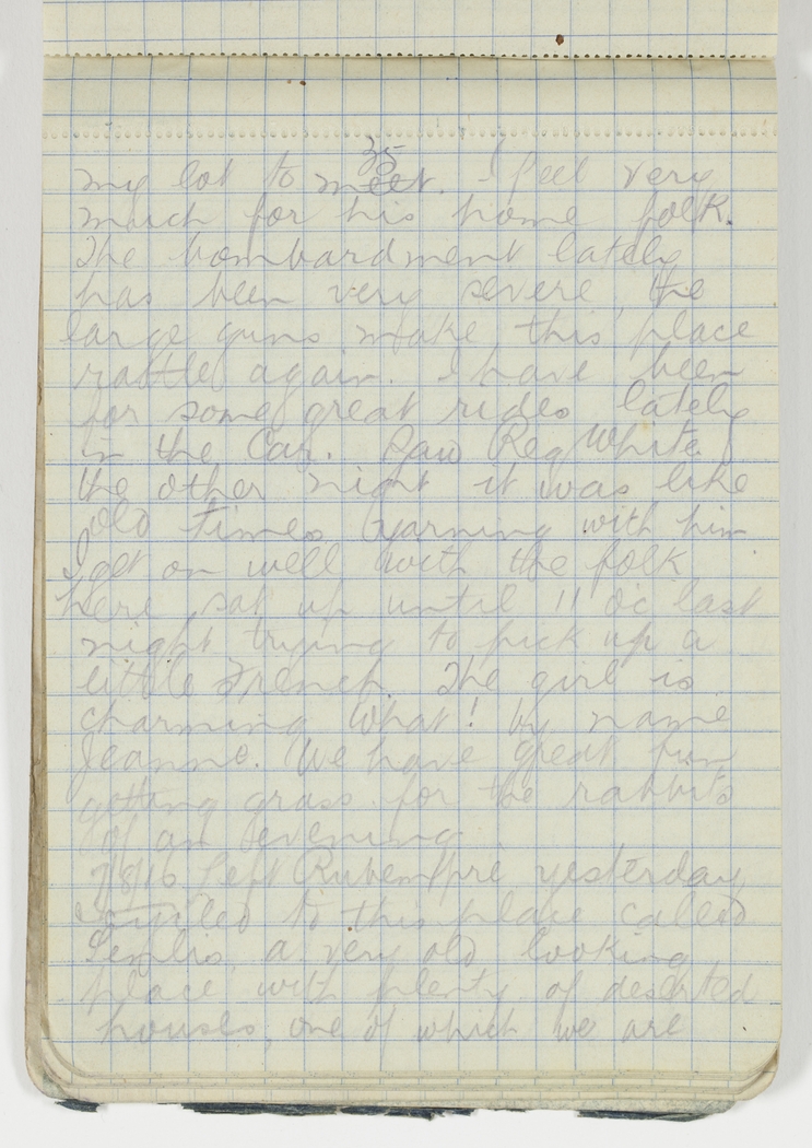 I have been for some great rides lately in the Car. Saw Reg White the other night it was like old times yarning with him. I get on well with the folk here sat up until 11 o'c last night trying to pick up a little French. The girl is charming What! by name Jeanne. We have great fun getting grass for the rabbits of an evening.