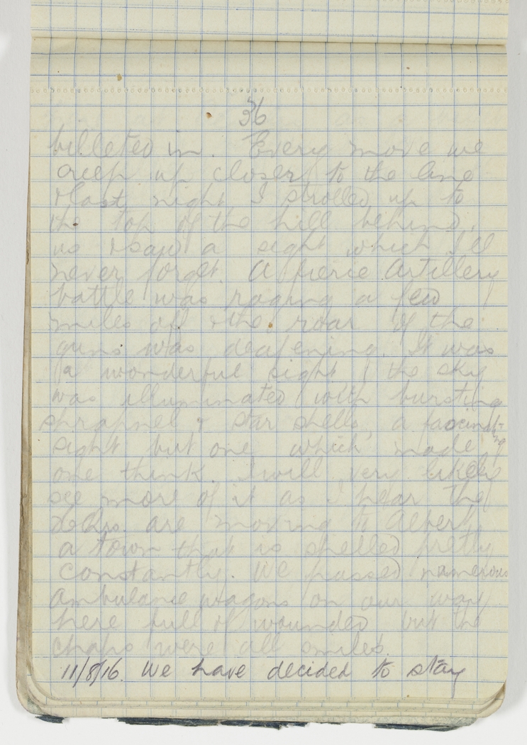Every move we creep up closer to the line & last night I strolled up to the top of the hill behind us & saw a sight which I'll never forget. A fierce Artillery battle was raging a few miles off & the roar of the guns was deafening. It was a wonderful sight, the sky was illuminated with bursting shrapnel & star shells, a fascinating sight but one which made one think.