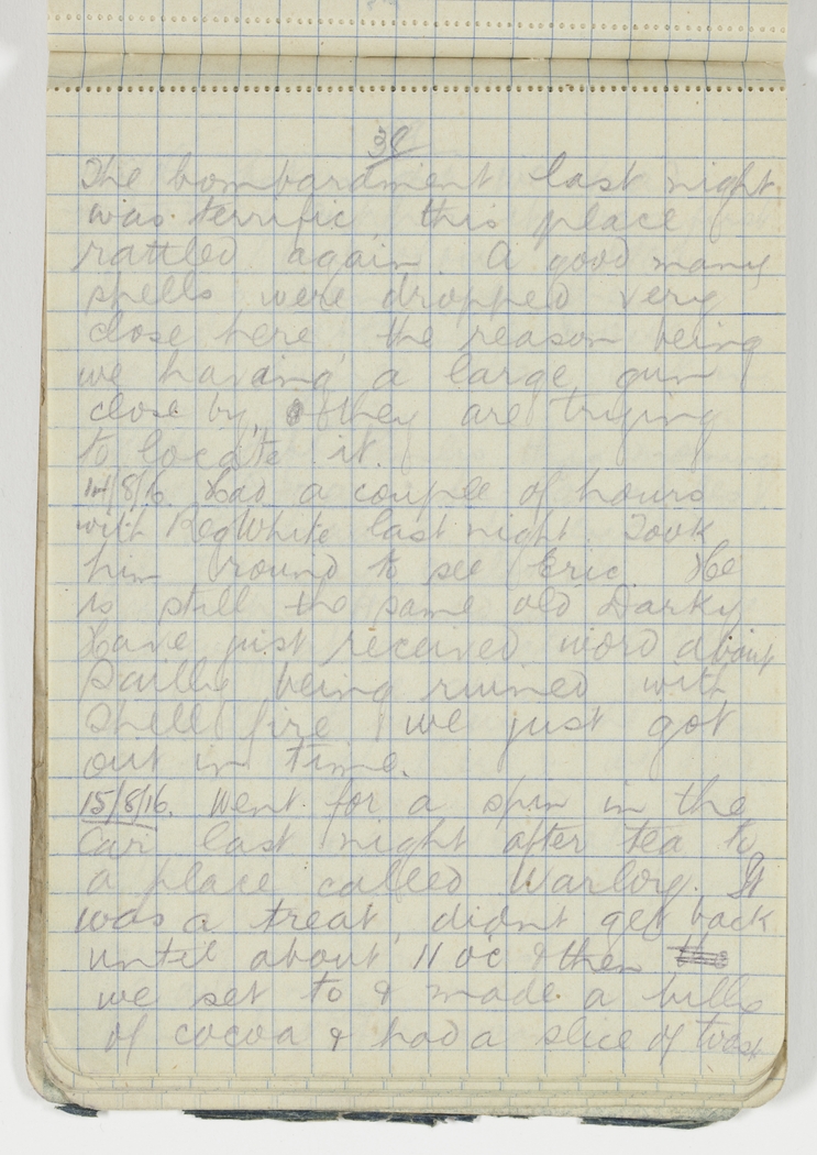 The bombardment last night was terrific, this place rattled again. A good many shells were dropped very close here, the reason being we having a large gun close by, & they are trying to locate it.