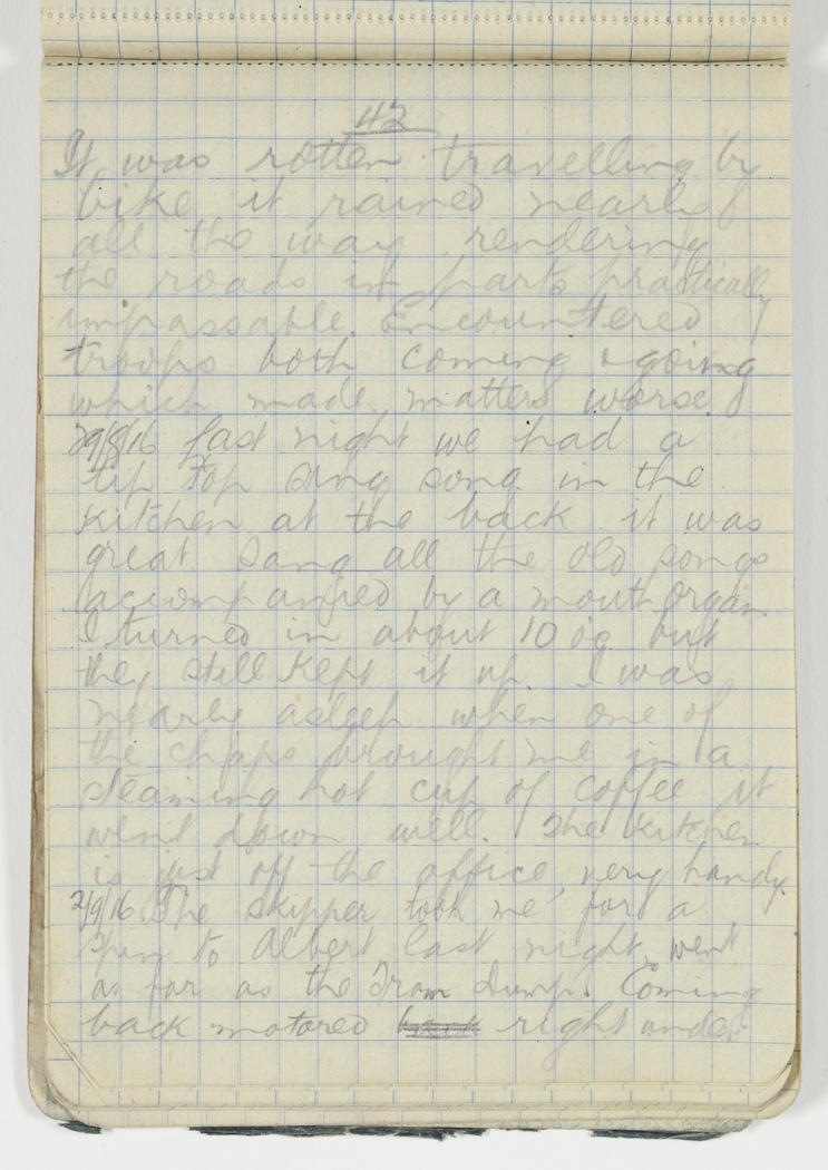 Last night we had a tip top sing song in the kitchen at the back it was great. Sang all the old songs accompanied by a mouth organ. I turned in about 10 o'c but they still kept it up. I was nearly asleep when one of the chaps brought me in a steaming hot cup of coffee it went down well. The kitchen is just off the office, very handy.