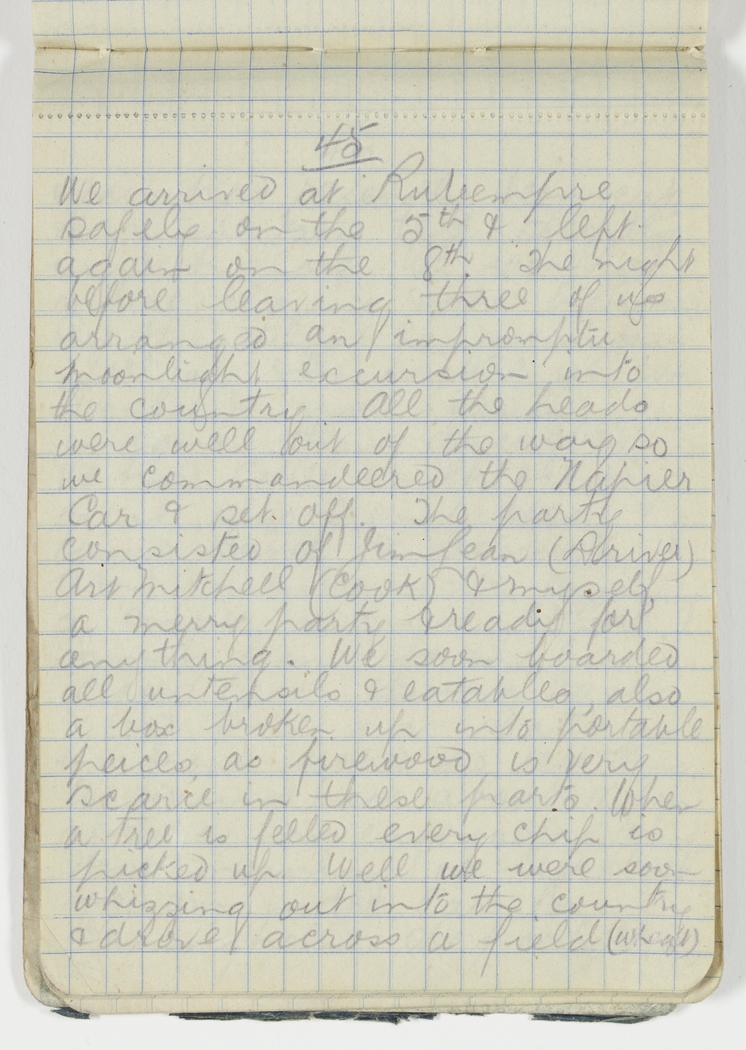 The night before leaving three of us arranged an impromptu moonlight excursion into the country. All the heads were well out of the way so we commandeered the Napier Car & set-off. The party consisted of Jim Lean (Driver) Art Mitchell (Cook) & myself, a merry party & ready for anything. We soon boarded all untensils & eatables, also a box broken up into portable peices, as firewood is very scarce in these parts. When a tree is felled every chip is picked up.