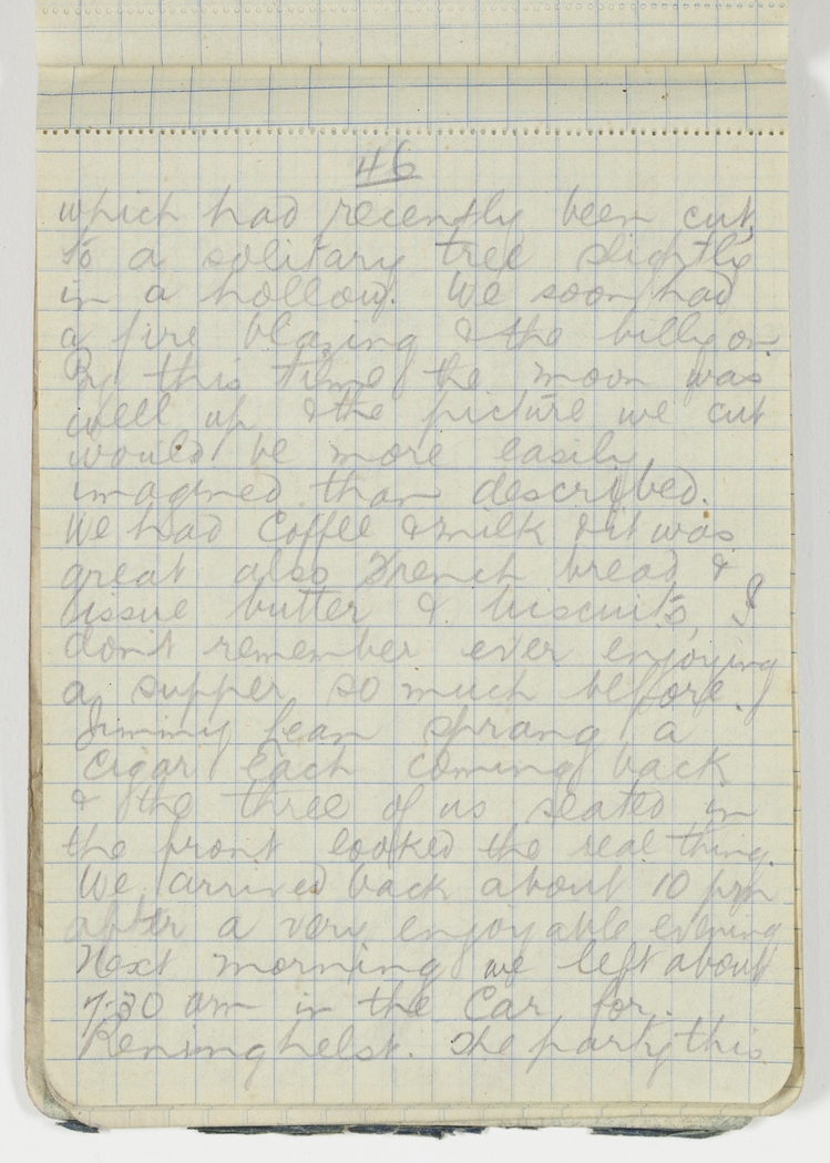 which had recently been cut, to a solitary tree slightly in a hollow. We soon had a fire blazing & the billy on. By this time the moon was well up & the picture we cut would be more easily imagined than described. We had Coffee & milk & it was great also French bread & issue butter & biscuits, I don't remember ever enjoying a supper so much before. Jimmy Lean sprang a cigar each coming back & the three of us seated in the front looked the real thing. We arrived back about 10 pm after a very enjoyable evening.
