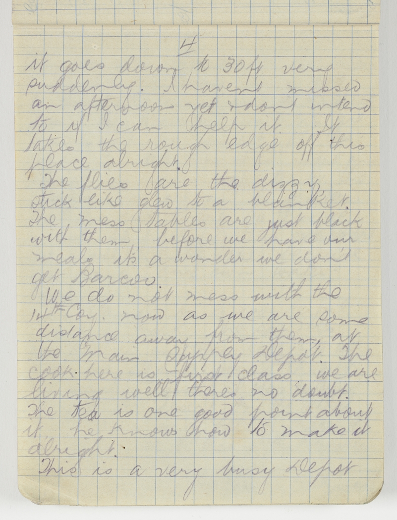 The flies are the dizzy, stick like glew to a blanket. The mess tables are just black with them before we have our meals its a wonder we don't get Barcoo.