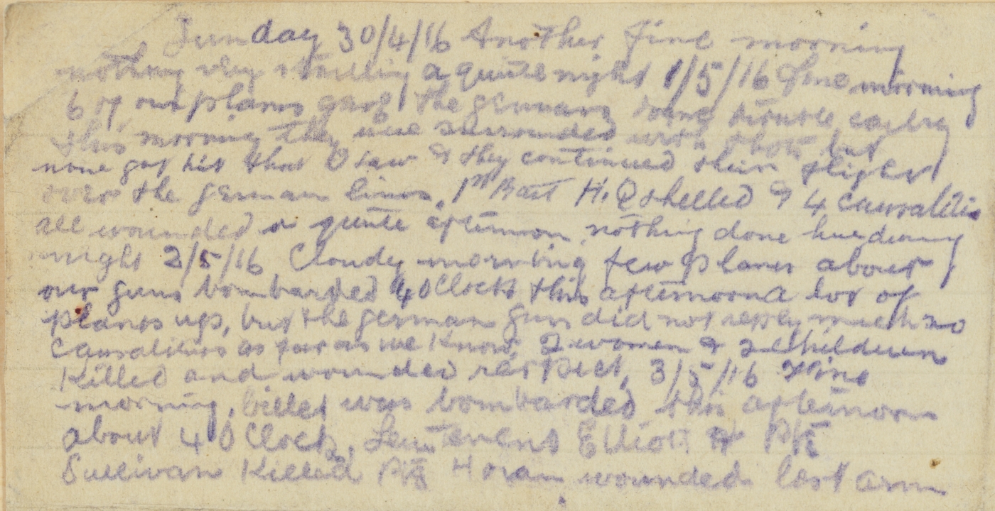 Sunday 30/4/16 Another fine morning nothing very startling a quite night 1/5/16 fine morning 6 of our planes gave the germans some trouble early this morning they were surrounded with shots but none got hit that I saw & they continued their flight over the german lines. 1st Batt H.Q. shelled & 4 casualities all wounded a quite afternoon, nothing done here during night 2/5/16 Cloudy morning few planes about our guns bombarded 4 O'Clock this afternoon a lot of planes up, but the german guns did not reply much no casualities as far as we know, 2 women & 2 children killed and wounded reported. 3/5/16 Fine morning, billet was bombarded this afternoon about 4 O'Clock. Leiutenent Elliott & Pte Sullivan killed Pte Horan wounded lost arm
