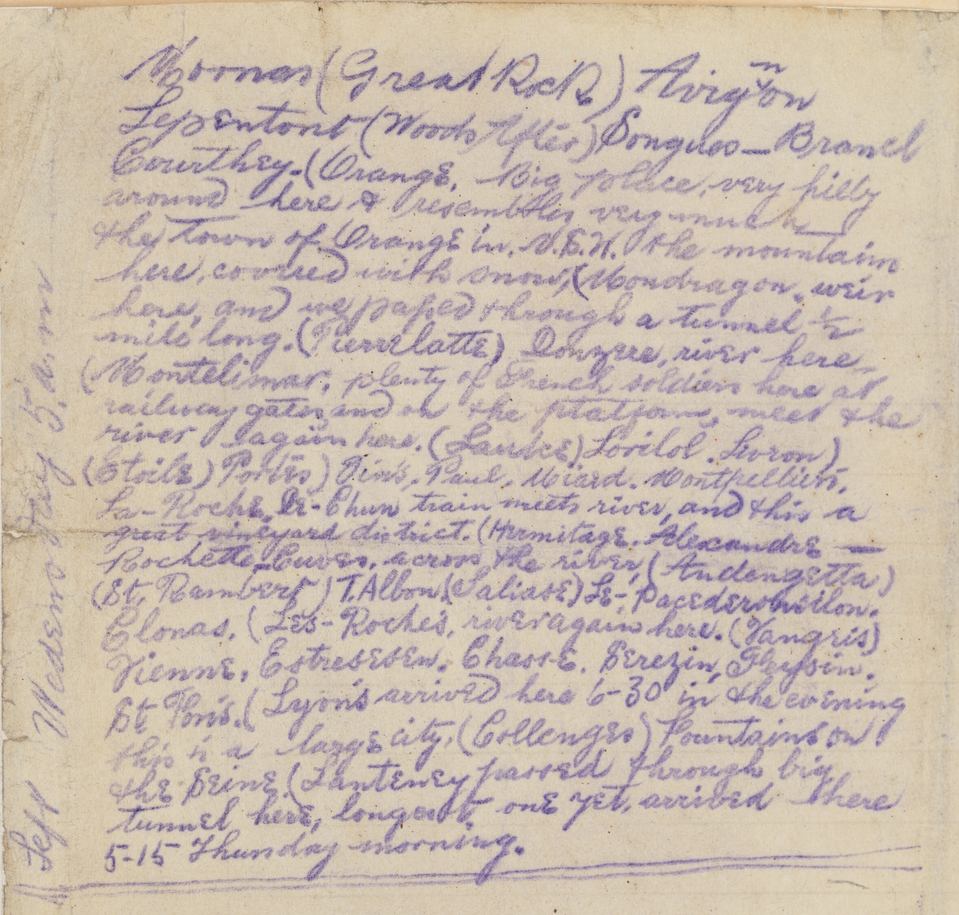 Nornon (Great Rock) Avignon Lepentont (Woods After) Sorgueo - Brand Courthey [Courthezon?] (Orange - big place, very hilly around here & resembles very much the town of Orange in N.S.W. the mountain here covered with snow (Mondragon weir here, and we passed through a tunnel 1/2 mile long (Pierrelatte) Donzere, river here (Montelimar, plentry of French soldiers here at railway gates and on the platforms, meet the river again here (Lautce) Lorilol, Luron) (Etoile) Portes) Tin's, Paul, Miard, Montpellier La Roche, De-Chun train meets river and this a great vineyard district. (Hermitage, Alexandra - Rochette, Cuvas, across the river (Andongetta) (St. Barmbert) T. Albon (Saliase) Le pacedersvoilone Clonas (Les-Roches, river again here (Tangris) Fienne, Estresesen, Chasse, Serezin, Gleijsin, St; Fon's (Lyon's arrived here 6-30 in the evening this is a large city (Collenges) Fountains on the Seine (Lantency passed through big tunnel here longest one yet arrived there 5-15 Thursday morning. [30/3/16]