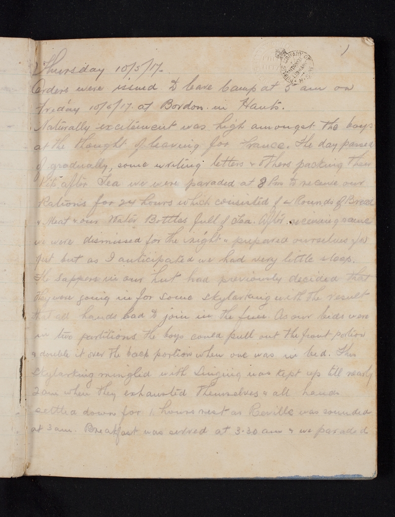 Orders were issued to leave Camp at 5 a.m. on Friday 10/5/17 at Bordon in Hants. Naturally excitement was high amongst the boys at the thought of leaving for France. The day passed of gradually, some writing letters & others packing their Kits after Tea we were paraded at 8 p.m to receive our Rations for 24 hours which consisted of 4 Rounds of Bread & Meat & our Water Bottles full of Tea. After receiving same we were dismissed for the night & prepared ourselves for rest but as I anticipated we had very little sleep. The sappers in our hut had previously decided that they were going in for some skylarking with the result that all hands had to join in the fun. As our beds were in two partitions the boys could pull out the front portion & double it over the back portion when one was in bed. This skylarking mingled with Singing was kept up till nearly 2 a.m. when they exhausted themselves & all hands settled down for 1 hours rest as Reville was sounded at 3 a.m. Breakfast was served at 3.30 am & we paraded