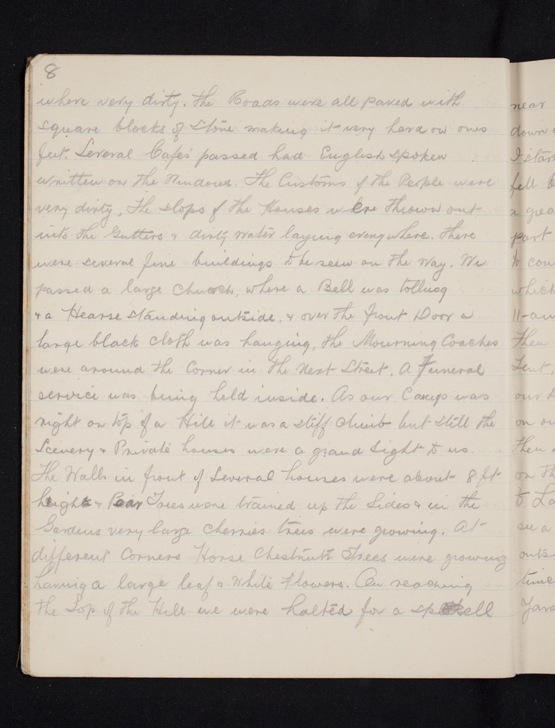 where very dirty. The Roads were all paved with square blocks of stone making it very hard on ones feet. Several Cafes passed had English spoken written on the windows. The Customs of the People were very dirty. The slops of the Houses were thrown out into the Gutters & dirty water laying everywhere. There were several fine buildings to be seen on the way. We passed a large Church, where a Bell was tolling & a Hearse standing outside & over the front Door a large black cloth was hanging, the Mourning Coaches were around the corner in the next street. A Funeral service was being held inside. As our camp was right on top of a Hill it was a stiff climb but still the Scenery & Private houses were a grand sight to us.
