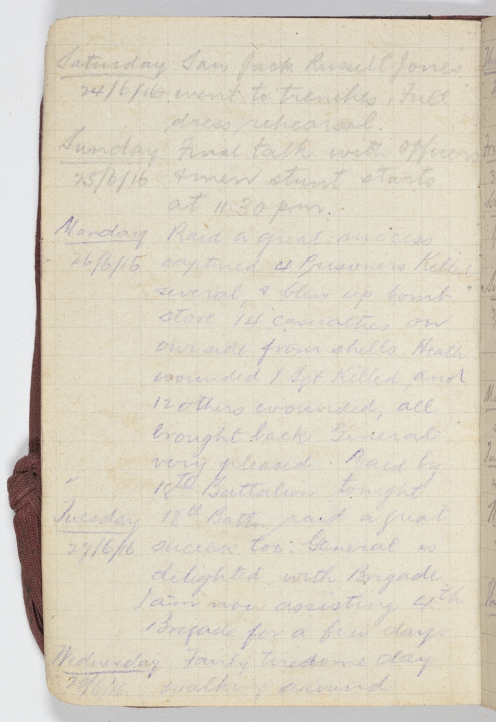 Monday 26/6/16 Raid a great success captured 4 Prisoners Killed several & blew up bomb store 14 casualties on our side from shells. Heath wounded 1 Sgt Killed, and 12 others wounded, all brought back. General very pleased. Raid by 18th Battalion tonight.
