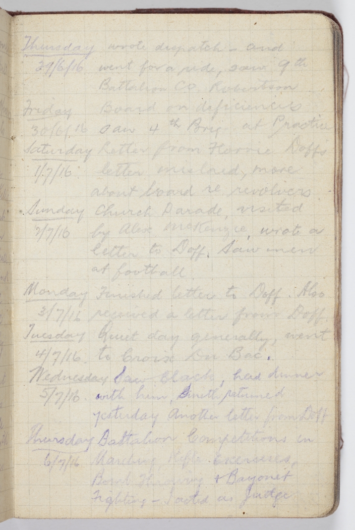 Sunday 2/7/16 Church Parade, visited by Alex McKenzie, wrote a letter to Doff. Saw men at football.