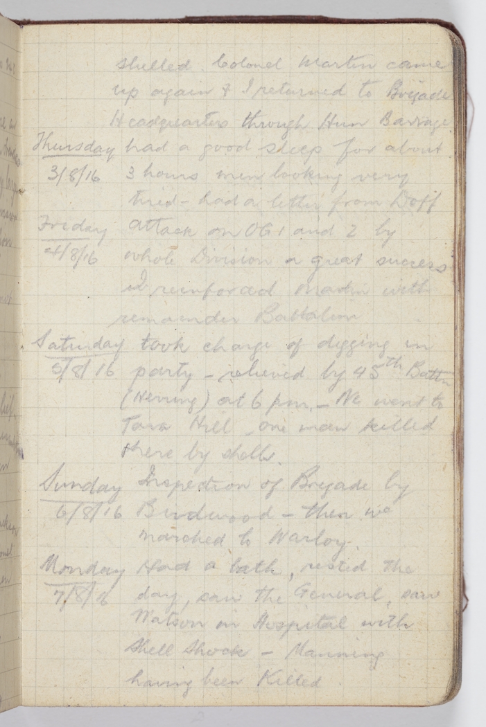 Monday 7/8/16 – Had a bath, rested the day, saw the General, saw Watson in Hospital wotj Shell shock – Manning having been Killed
