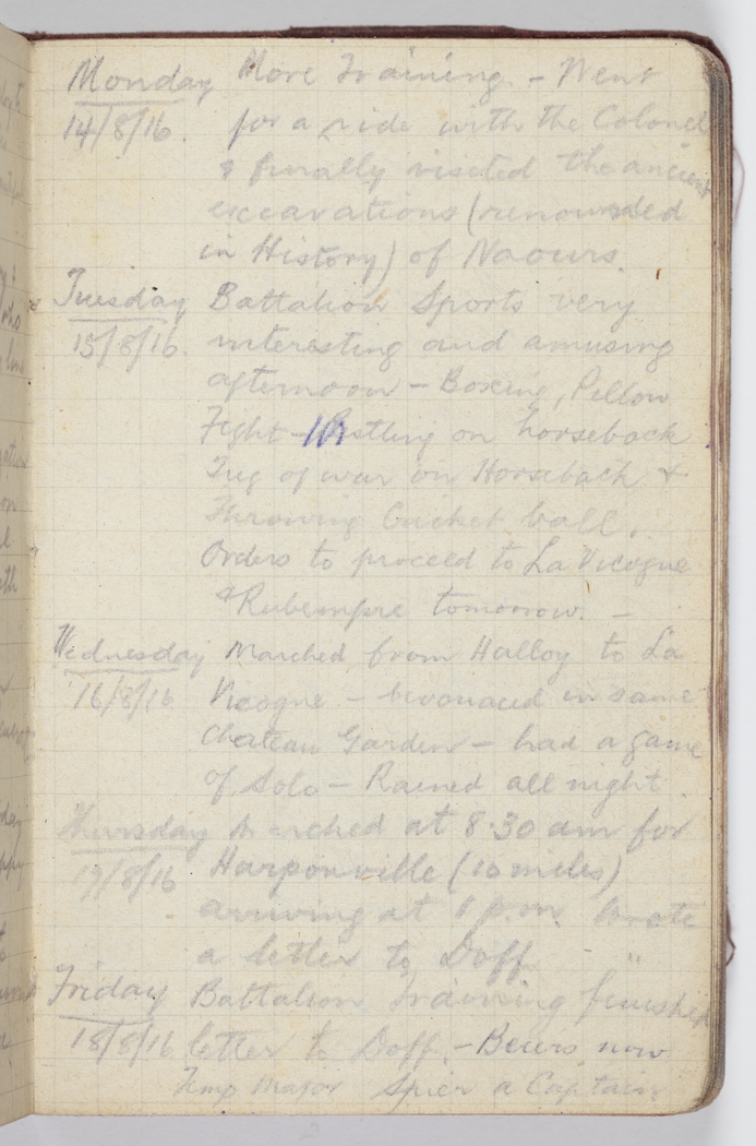 Friday 18/8/16 Battalion training finished letter to Doff - [indecipherable] now Temp Major Spier a Captain