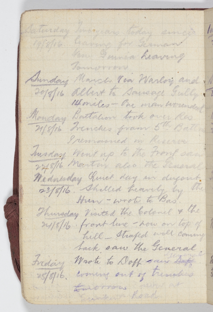 Friday 25/8/16 Wrote to Doff – saw Doff General coming out of trenches tomorrow move out [indecipherable] Road