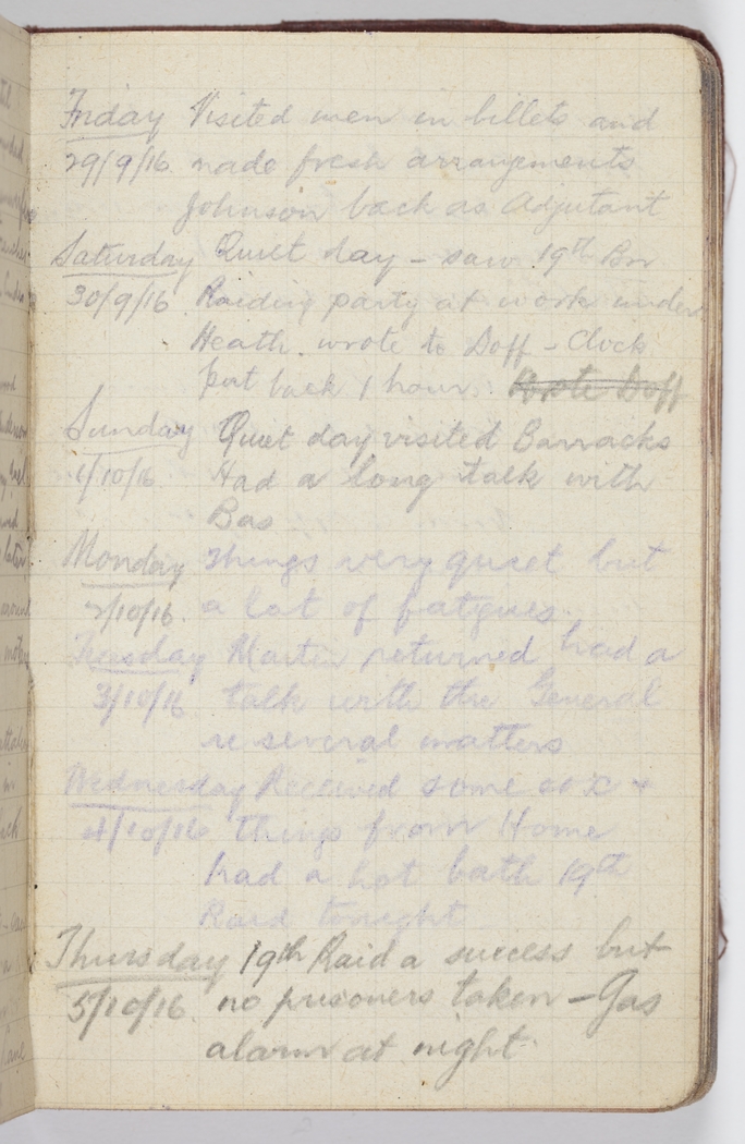 Saturday 30/9/16 Quiet day – saw 19th Bn. Raiding party at work under Heath wrote to Doff – Clock put back 1 hour Wrote Doff
